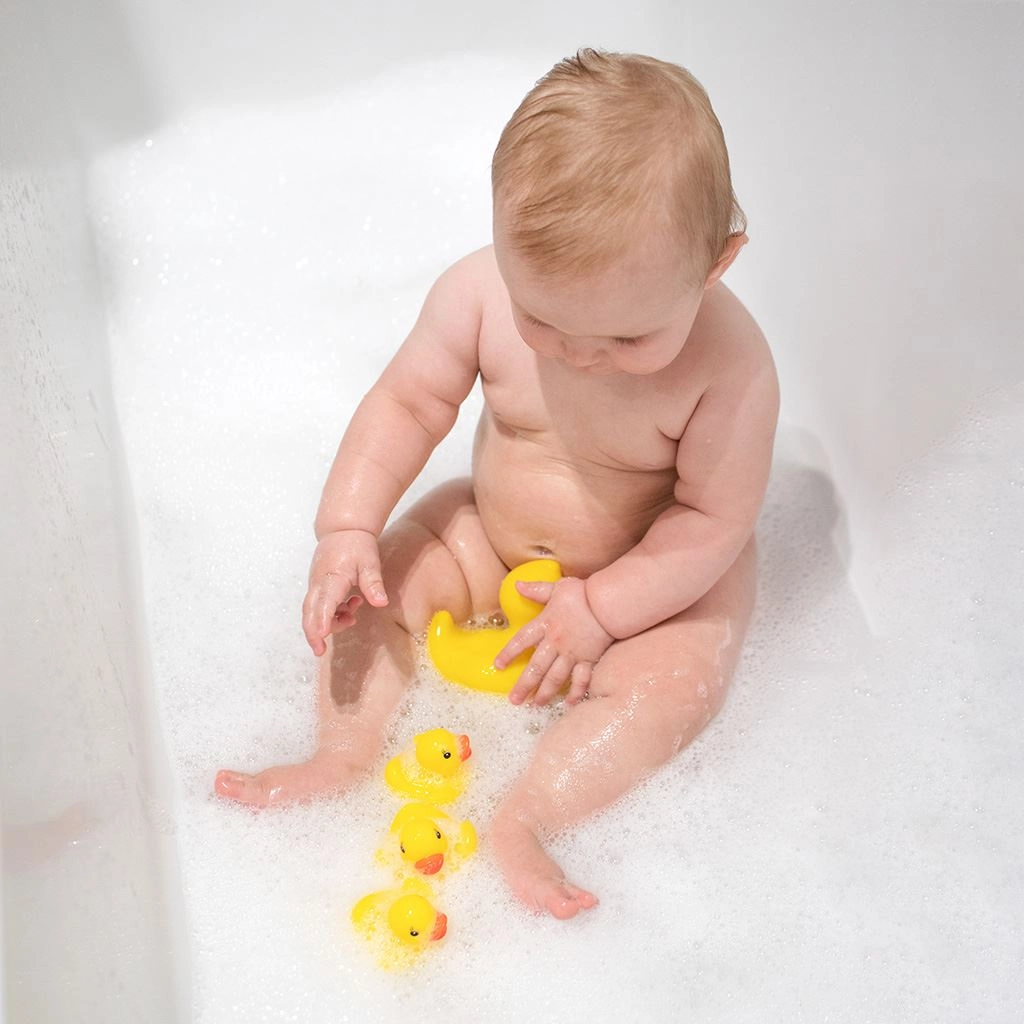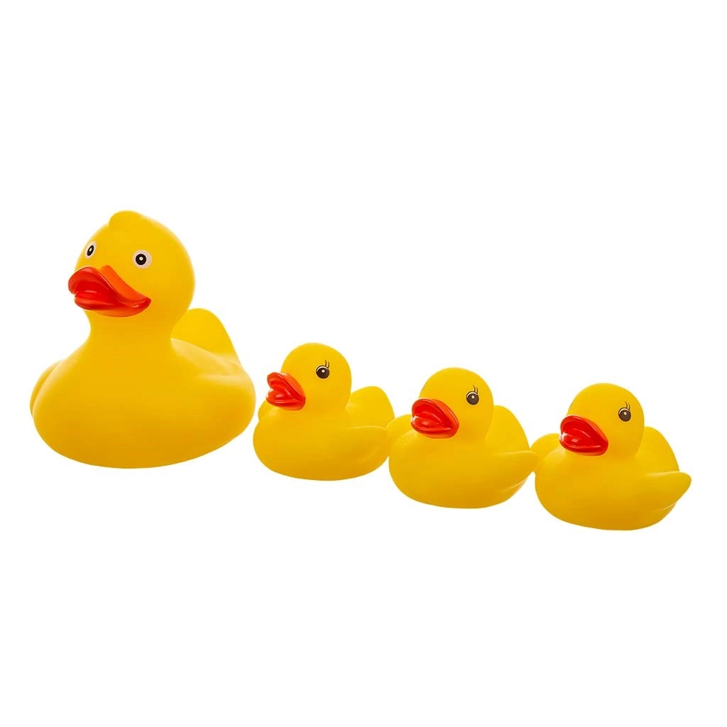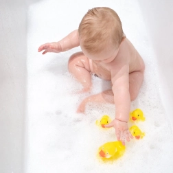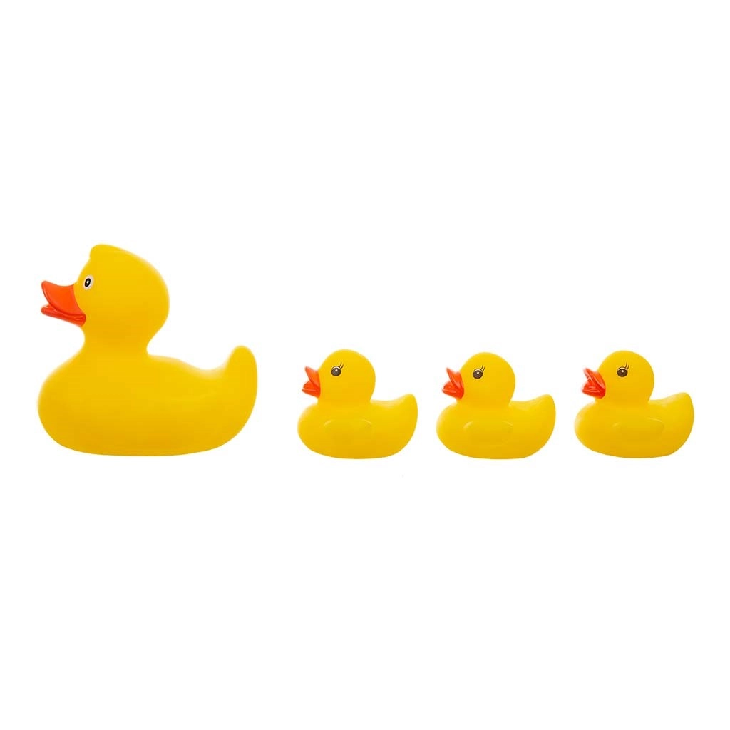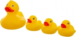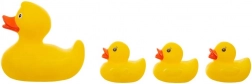 S tem ljubkim račjim kompletom bo vsako kopanje veselo doživetje. Komplet vsebuje 1 veliko raco in 3 male račke, ki plavajo in zaradi odprtine omogočajo špricanje vode. Živo rumena barva spodbuja vizualno zaznavanje, oblika prilagojena otroškim ročicam pa razvija fino motoriko.