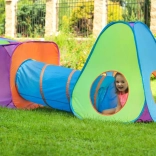 Set 3v1 otrokom prinaša veliko gibanja, domišljije in veselja. Dva barvna šotora povezuje prilagodljiv tunel, ki se preprosto vstavi v šotora – ni trajno pritrjen, zato ga lahko poljubno premikate in spreminjate postavitev. Zaradi nizke teže in zložljive konstrukcije je komplet enostavno prenosljiv in pripravljen za igro v nekaj sekundah.