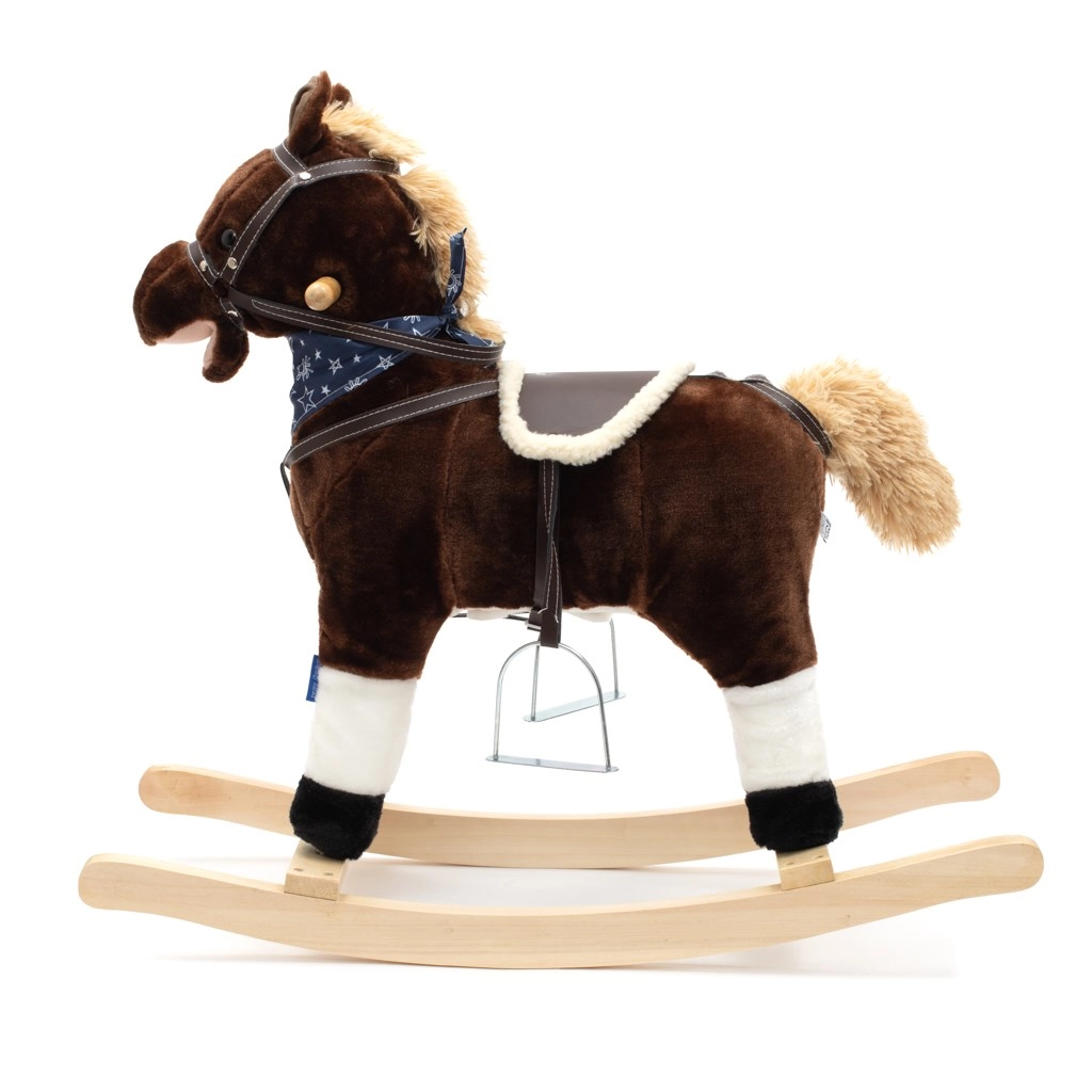 Gugalni konjiček Baby Mix otrokom prinaša pristen doživljaj jahanja. Izdelan je iz mehkega pliša, ima stilsko rutko in v ušeskih skrite gumbe, ki sprožijo zvoke galopa, rezgetanje, gibanje repa in gobčka ter kavbojsko pesmico. Profilirane lesene gugalne letve preprečujejo prevrnitev, medtem ko kovinska stremena, ročaji in udobno sedlo zagotavljajo udobje in stabilnost pri guganju.