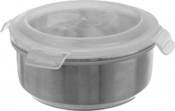 Ta praktična okrogla posoda je odlična za vsakodnevno uporabo doma, v službi in na poti. Posoda je izdelana iz kakovostnega nerjavnega jekla, pokrov iz trpežne prozorne plastike za hitro preverjanje vsebine brez odpiranja. Zahvaljujoč štirim čvrstim zapenjalom in gumijastemu tesnilu ostane vse v notranjosti varno zaprto in dlje časa sveže.