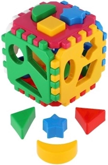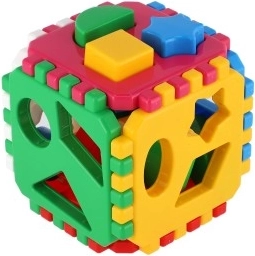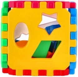 Klasična vstavljanka za najmlajše razvija fino motoriko, logično razmišljanje in prepoznavanje oblik in barv. Barvni koščki se vstavljajo v ustrezne odprtine, posamezne stranice kocke pa so povezane z nazobčanimi robovi za enostavno sestavljanje. Idealna didaktična igrača za otroke od 12 mesecev naprej.