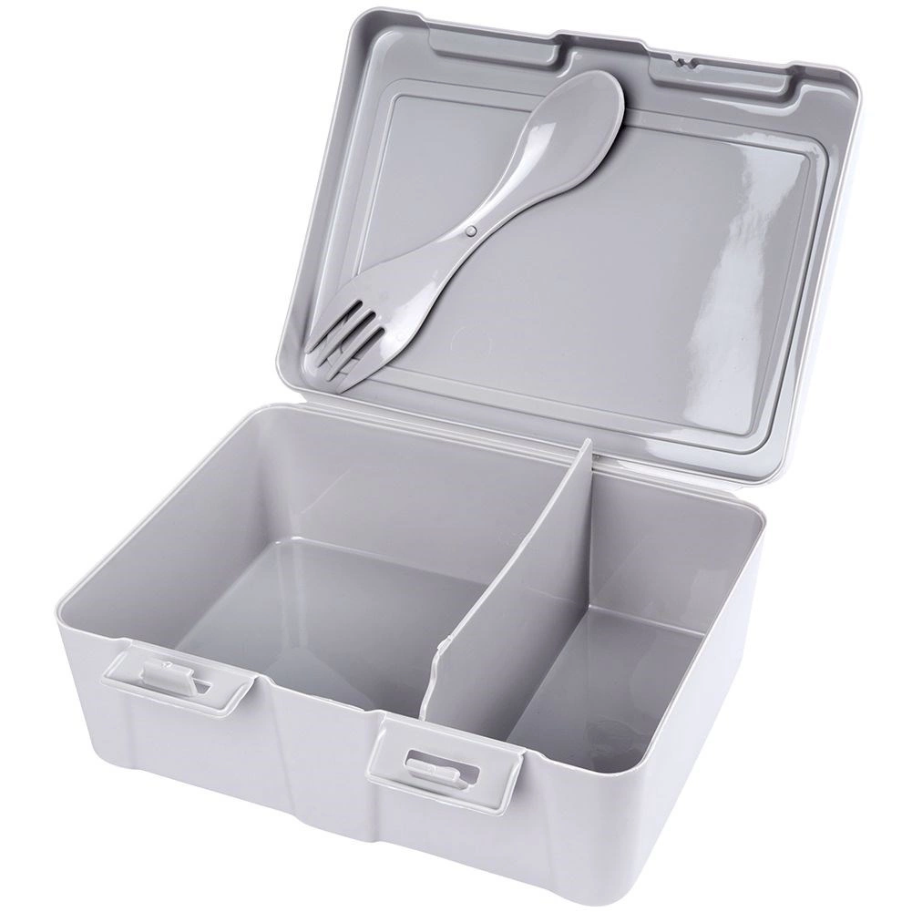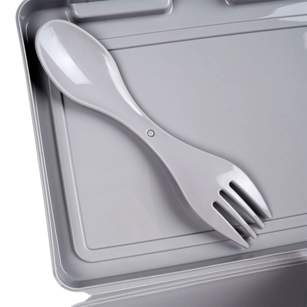 Škatla za malico z dvema predelkoma ohranja vašo hrano urejeno ločeno in svežo. Del kompleta je pameten pribor 2v1 (žlička/vilica) dolžine 14,5 cm, ki ima svoje mesto pod pokrovom, zato ga boste imeli vedno pri roki. Trpežna izvedba, kompaktne mere in močne sponke zagotavljajo zanesljivo zapiranje med prenašanjem.