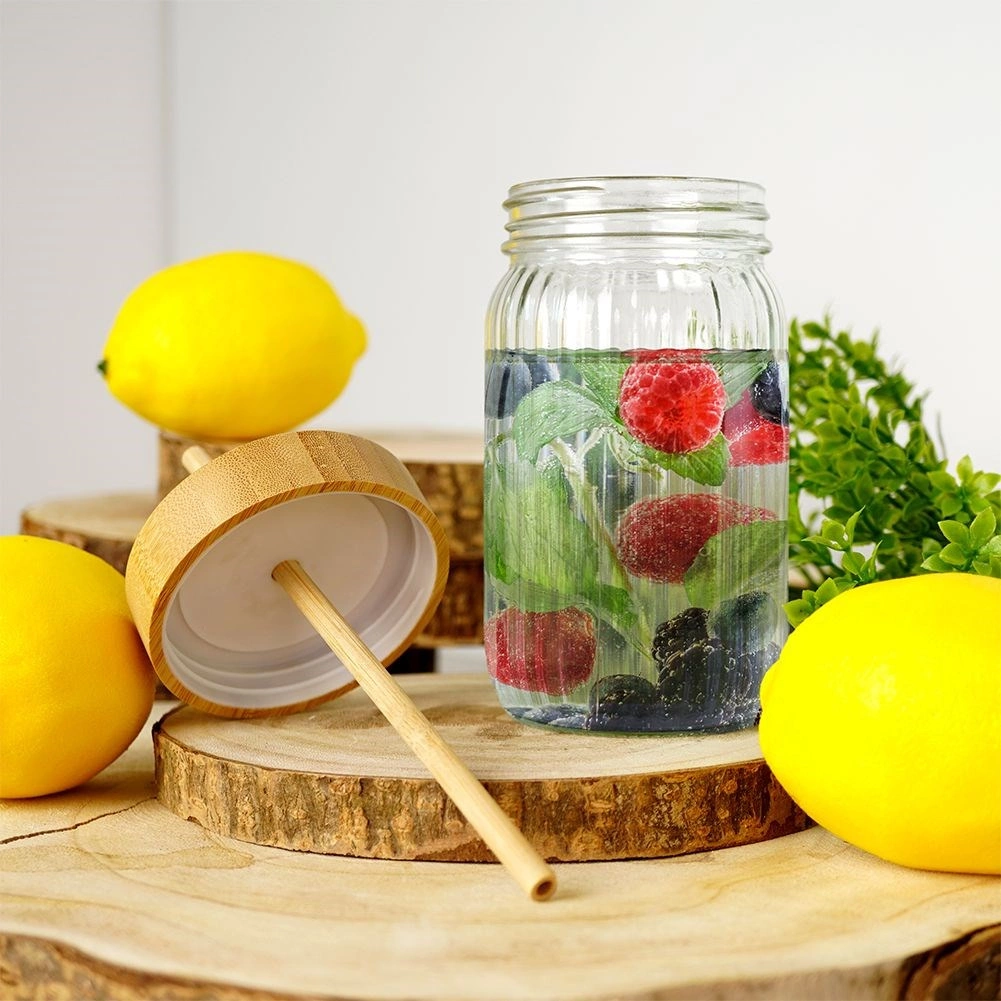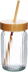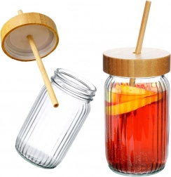 Ta eleganten stekleni “mason” tumbler združuje funkcionalnost in naraven videz. Rebrasto prozorno steklo lepo sede v roko, bambusov pokrov z navojem zanesljivo zatesni pijačo, večkratno uporabna bambusova slamica pa zagotavlja udobno srkanje. Odličen za vodo s sadjem, domače limonade, smoothieje in ledeno kavo – doma, na terasi ali na vrtu.