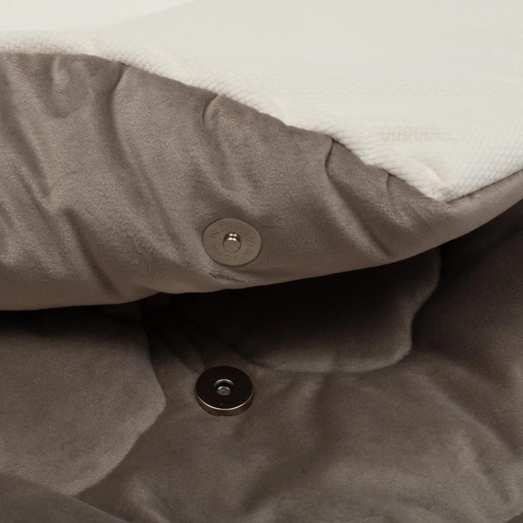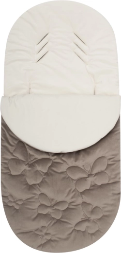 Mehka notranja plast iz gladkega velvet/minky (100 % poliester) je prijetna na dotik in greje, antialergijsko polnilo pa nudi lahko in učinkovito izolacijo. Zunanja semišasta tkanina z motivom metuljev deluje elegantno in je prijetna na dotik. Odprtine za 5-točkovne pasove držijo vrečo na mestu in zagotavljajo varno pripenjanje otroka.