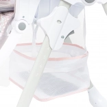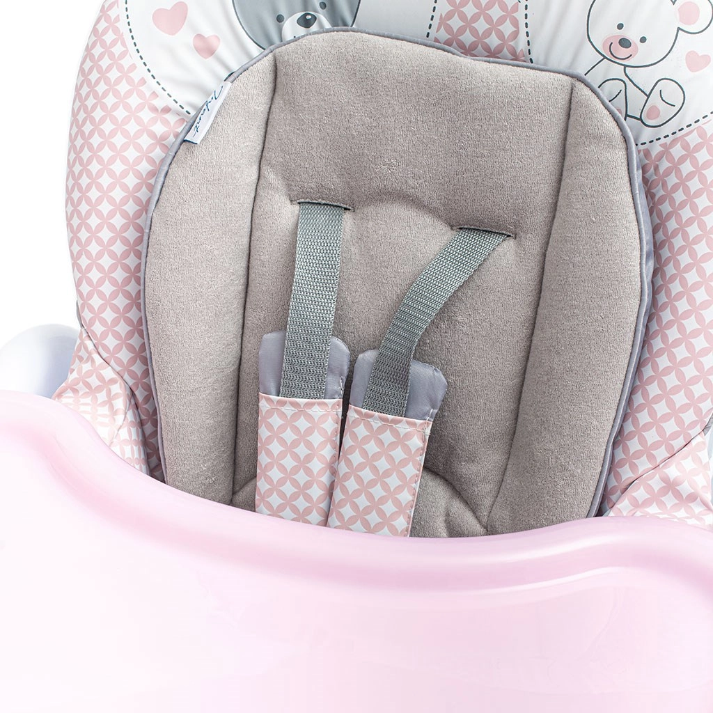 Stolček za hranjenje BABY MIX Infant roza združuje udobje, varnost in enostavno vzdrževanje v enem. S 7-stopenjsko nastavitvijo višine ga zlahka prilagodite višini mize in rasti otroka. Trije položaji naslonjala in dvo-položajna opora za noge zagotavljajo pravilno ergonomijo pri hranjenju in počitku. Praktičen dvojni, odstranljiv pladenj nudi prostor za hrano in igro, medtem ko spodnja košarica ohranja vse potrebščine pri roki.