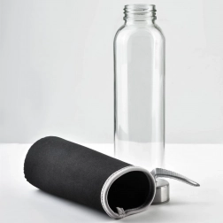 Stilska in trpežna steklena steklenička s prostornino 490 ml združuje čist dizajn, varne materiale in praktične podrobnosti za udobno vsakodnevno uporabo. Nerjaveč pokrovček na navoj s silikonskim tesnilom preprečuje iztekanje, medtem ko snemljiv neoprenski ovitek izboljšuje oprijem, izolacijo in ščiti stekleničko pred udarci.