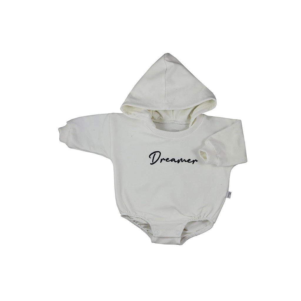 Slogovno in praktično body za dojenčka, ki bo zahvaljujoč dolgim rokavom, kapuci in udobnemu zapiranju s pritiskači med nogicami ohranilo vašega malčka na toplem in v udobju. Mehka trenirkovina iz 96 % bombaža in 4 % elastana je zračna in raztegljiva, medtem ko baggy kroj zagotavlja svobodo gibanja. Napis Dreamer doda moderen videz.