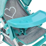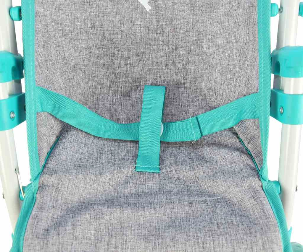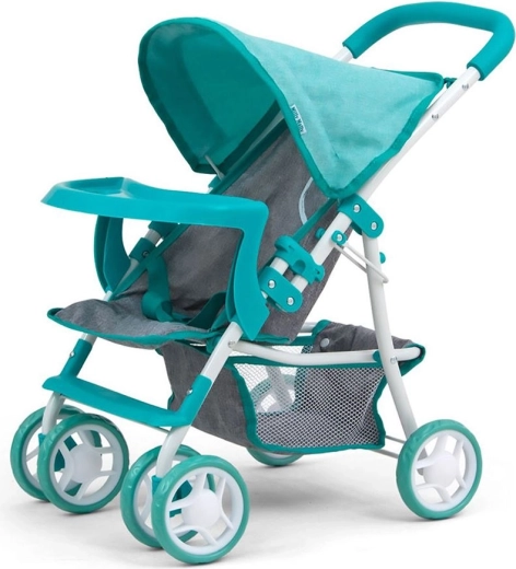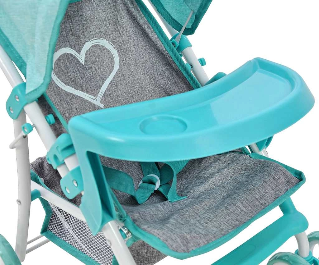 Voziček za punčke MILLY MALLY Kate Prestige Mint verno spominja na pravi športni voziček. Kovinski okvir zagotavlja trdnost, nizka teža pa olajša upravljanje tudi mlajšim otrokom. Punčka je v sedežu pritrjena s pasovi, sprednji odstranljiv pladenj pa služi kot praktična banjica za »priboljške«. Zložljiva strešica ščiti punčko med sprehodi na prostem.