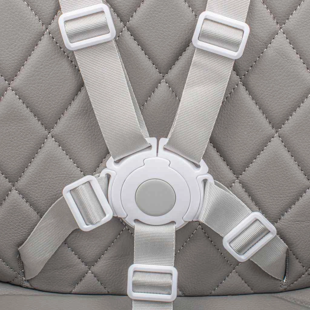 Mehko oblazinjenje iz eko usnja, bočna opora in 5-točkovni pasovi zagotavljajo stabilnost in varnost otroka pri vsakem obroku.