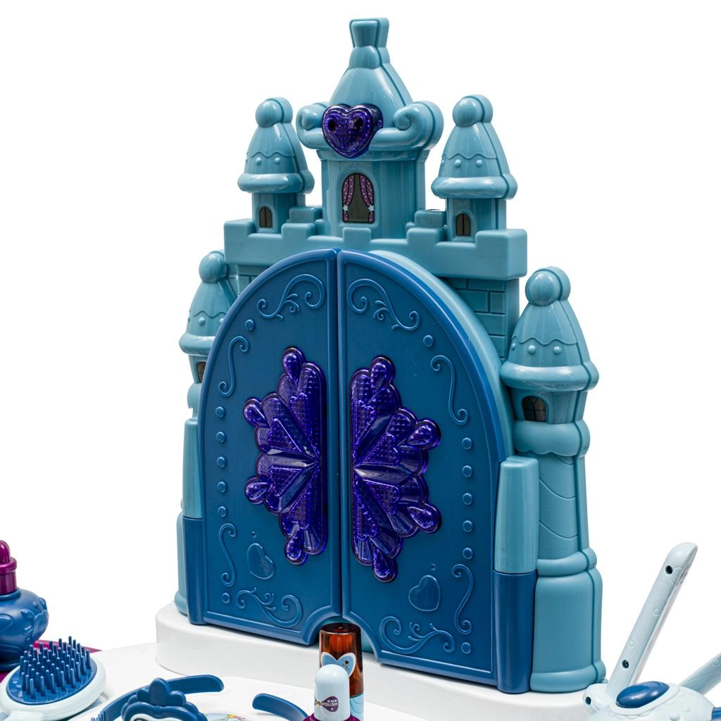 Podarite otrokom njihov lasten čarobni kotiček lepote. Toaletna mizica BABY MIX v ledenem dizajnu navduši z efektnim ogledalom, ki se odpre s pritiskom na čarobno paličko, ter pritegne s svetlobnimi in zvočnimi učinki. Praktičen predal shrani vse drobnarije, stolček pa poskrbi za udobno sedenje med igro.