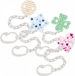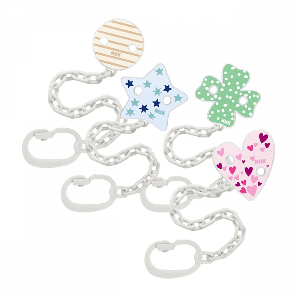 Verižica za dudo z zaponko NUK je zasnovana tako, da je duda vedno pri roki in čista. Praktična zaponka se zlahka pripne na otroška oblačila in drži trdno, zato se duda ne izgubi niti med sprehodi in potovanji. Žive barve in veseli motivi spodbujajo vizualno zaznavanje in pritegnejo pozornost tudi najmlajših dojenčkov.