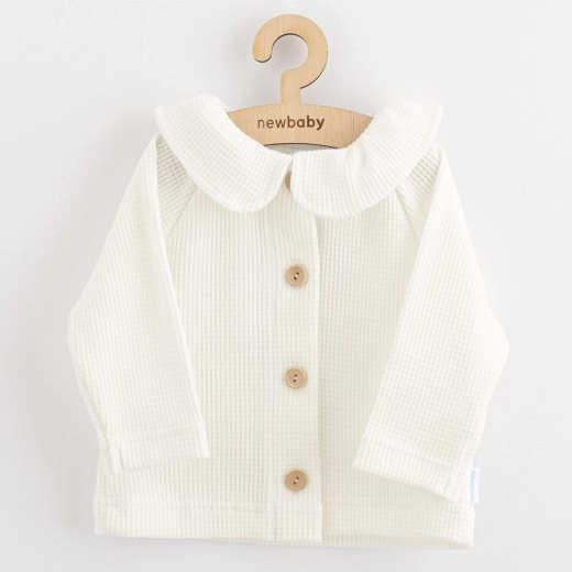 Ta bel otroški jopič je idealen za vsakodnevno nošenje in posebne priložnosti. Zaradi premišljenega kroja, ovratnika in lesenih gumbov deluje nežno in elegantno, hkrati pa je maksimalno udoben. Naravni 100% bombaž je zračen, mehak in nežen do občutljive otroške kože.