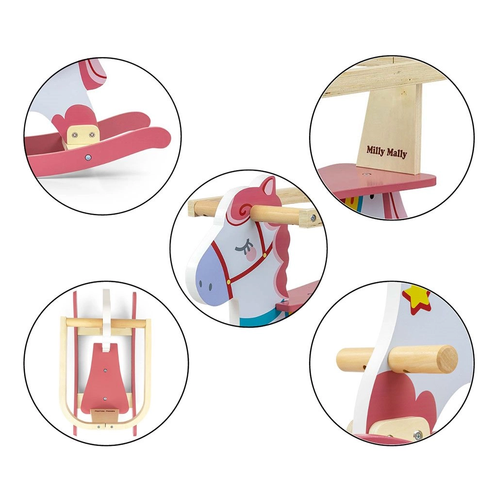 Prisrčen leseni gugalni konjiček MILLY MALLY Lucky v rožnati barvi prinaša otrokom od 12 do 36 mesecev veliko varne zabave. Ima odstranljive varnostne ograje, ročaje za zanesljiv oprijem, opore za noge in stabilne, profilirane smuči za udobno in uravnoteženo guganje. Izdelan je iz kakovostnega lesa in premazan z netoksičnimi, okolju prijaznimi barvami.