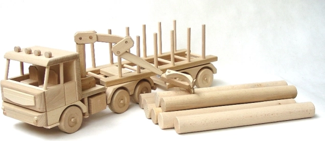 Ta robusten lesen tovornjak je premišljen do zadnje podrobnosti. Otroci bodo uživali v preprostem nakladanju in razkladanju zahvaljujoč premični roki, odstranljivim hlodom in prikolici, ki se obrača v stran. Izdelan je iz trdega bukovega lesa, ki prenese tudi intenzivno otroško igro.