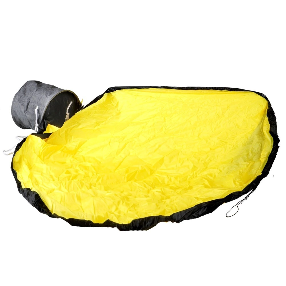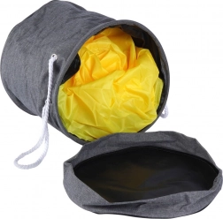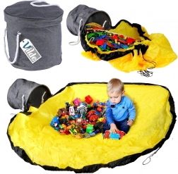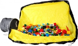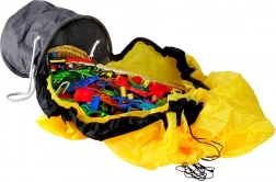 Velika rumena podloga s črnim robom se po igri zategne z vrvico in spremeni v vrečo – igrače se ne skrijejo pod pohištvo, pospravljeno je v minuti.