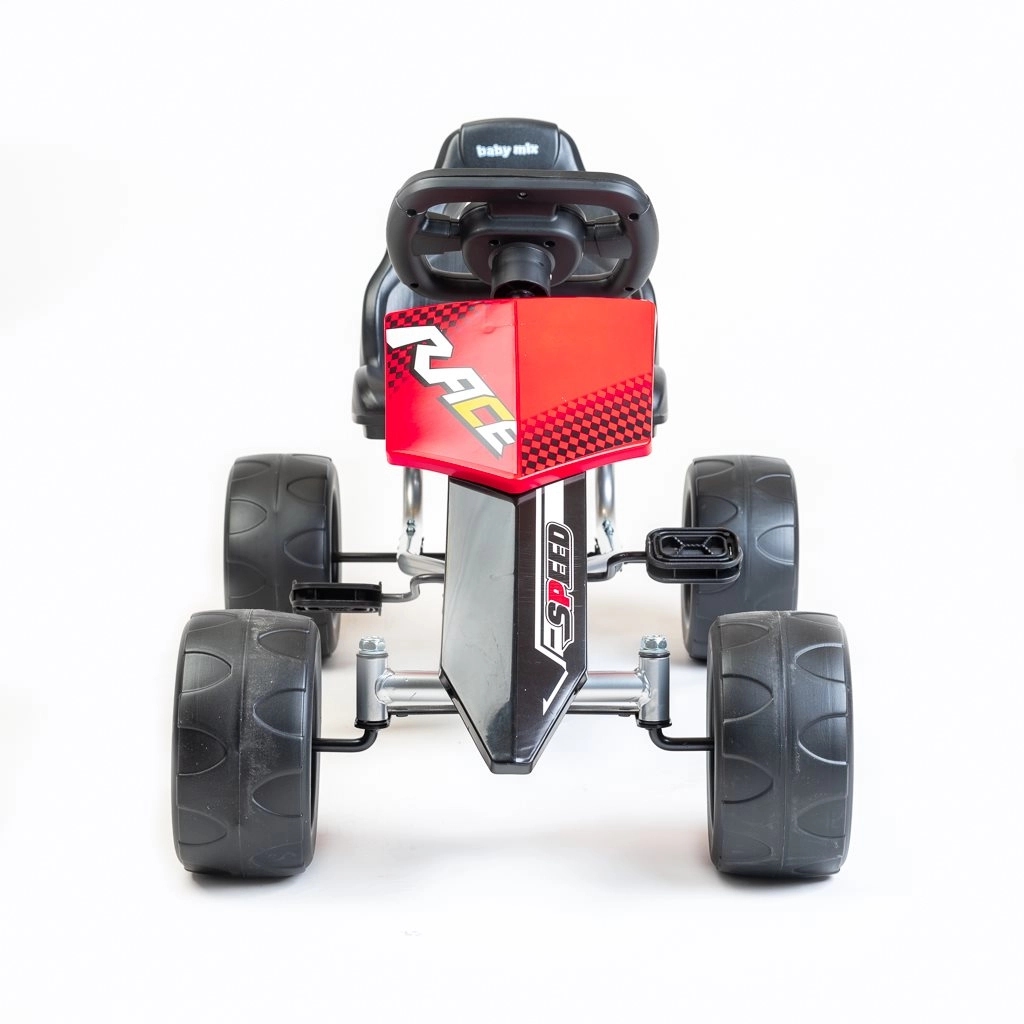 Gokart Baby Mix Speedy je odlična izbira za aktivne otroke, ki imajo radi gibanje na svežem zraku. Trdna kovinska konstrukcija z vzdržljivimi plastičnimi elementi, športni volan in pokrov verige povečujejo varnost in udobje. Igra z gokartom razvija gibalno koordinacijo, domišljijo in samostojnost.