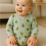 Odkrijte udobje muslina v dojenčkovem bodiju NEW BABY AVOCADO. Lahka in zračna tkanina je idealna za vsakodnevno nošenje in občutljivo kožo novorojenčkov. Prisrčen celoplošen potisk avokad doda dojenčkovi garderobi igriv pridih.