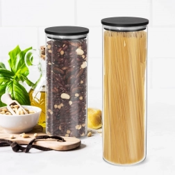 Ta visoka, vitka steklena posoda bo postala stilski in praktičen pomočnik za organizacijo shrambe in kuhinjskega pulta. Borosilikatno steklo je lahko, čvrsto in odporno na temperaturne spremembe, medtem ko silikonsko tesnilo v pokrovu zagotavlja zanesljivo zrakotesnost in daljšo svežino sestavin.