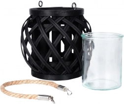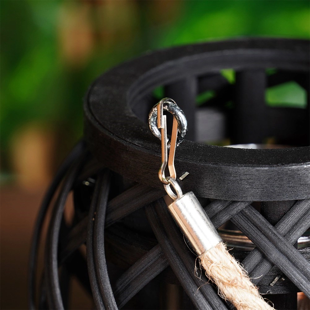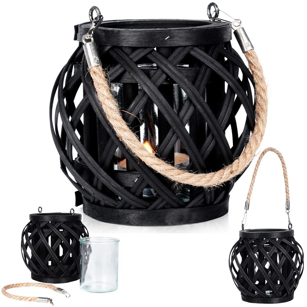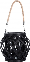 Ta dekorativni lampijon iz naravnega bambusovega lesa, lakiranega na črno, je idealen za večerne trenutke na balkonu, terasi ali v dnevni sobi. Odprta pletena konstrukcija ustvarja učinkovite svetlobne odseve in prostoru doda prijetno, pomirjujočo atmosfero.
