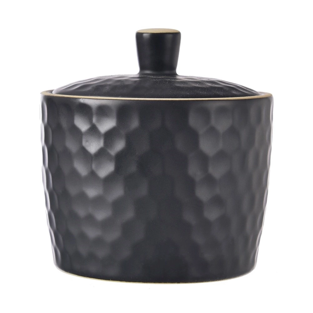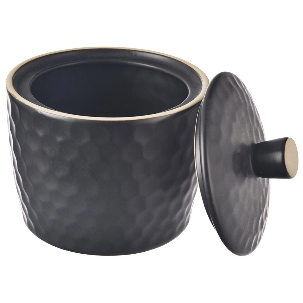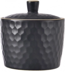 Ta elegantna sladkornica iz linije TEA TIME izstopa z modernim črnim videzom in reliefom v slogu čebeljega satovja. Kakovostna kamenina zagotavlja dolgo življenjsko dobo ter prijetno, mat teksturirano površino, ki dobro leži v roki.