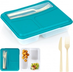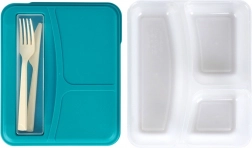 Ta kompaktna posoda za kosilo s 3 ločenimi deli ohranja glavno jed, solato in prigrizek pregledno razdeljene. Pokrov v turkizni barvi skriva praktičen pribor – nož in vilico – zato imate vse pri roki, kjerkoli ste. Varna izvedba brez BPA je prijazna do zdravja in živil.