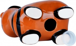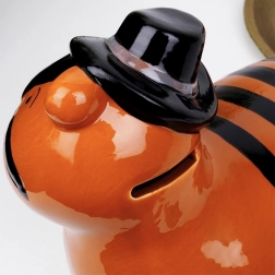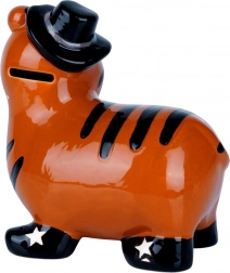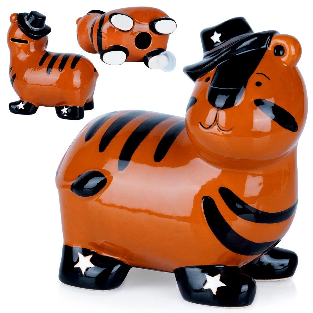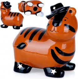 Ta keramični hranilnik v obliki tigra združuje funkcionalnost in dekorativni videz. Bleščeča oranžna površina s črnimi črtami, klobukom in zvezdicami na čeveljcih doda igriv značaj, ki poživi otroško sobo ali moderen interier. Zahvaljujoč spodnji odprtini z odstranljivim zamaškom lahko prihranke večkrat vzamete brez razbijanja.
