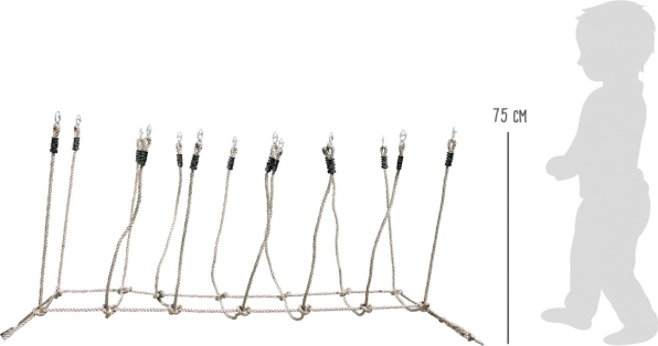 Viseči most SMALL FOOT je odličen dodatek za vrt ali otroško igrišče. Otrokom nudi zabaven in varen način za vadbo ravnotežja, močnega prijema in koordinacijskih spretnosti. Montaža je zaradi kovinskih ušes vprašanje trenutka – most preprosto napnete med dve trdni točki, idealno drevesi.
