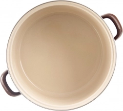 Eleganten lonec v retro slogu združuje rjavo zunanjo površino s kremasto notranjostjo in nerjavnim robom za večjo vzdržljivost. Zdravju neškodljiv emajliran premaz je prijazen do jedi in alergikov, omogoča enostavno čiščenje ter dolgo življenjsko dobo. Zaradi prostornine 8 l boste brez težav pripravili jušne osnove, golaž in testenine za vso družino.