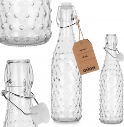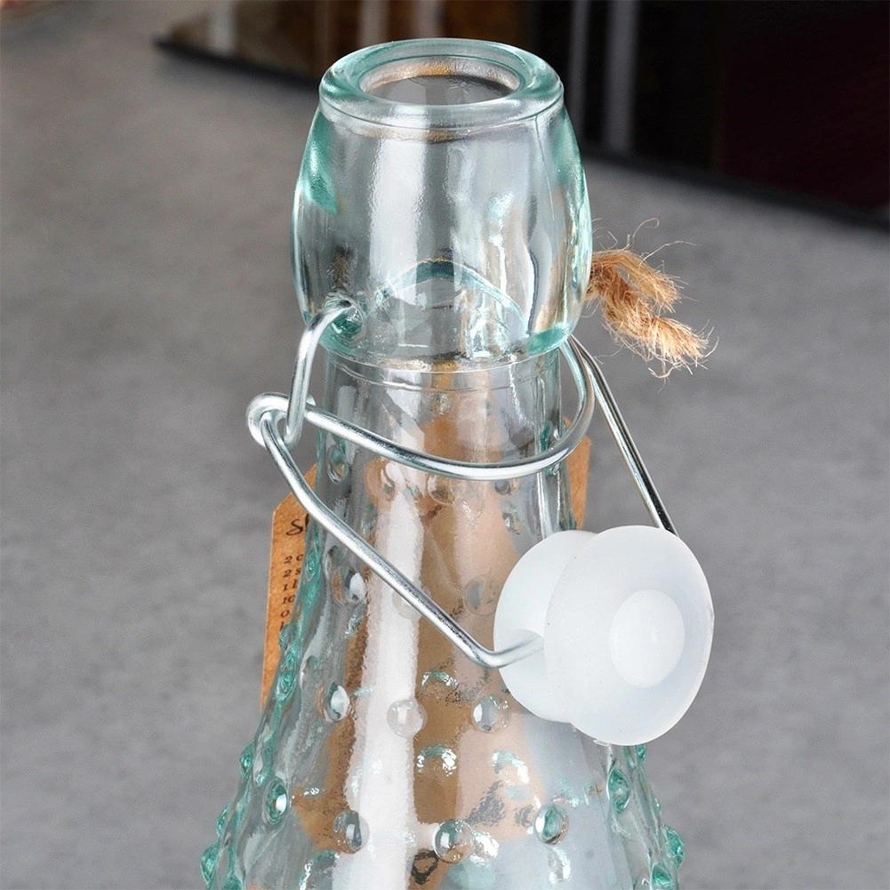 Ta steklena steklenica s prostornino 500 ml združuje praktičnost in privlačen retro dizajn. Zaradi prozornega stekla z nežnim rebrastim vzorcem lepo izstopa barva napitka, medtem ko patentno zapiranje s sponko in silikonskim tesnilom zagotavlja varno in tesno zapiranje brez tveganja razlitja.