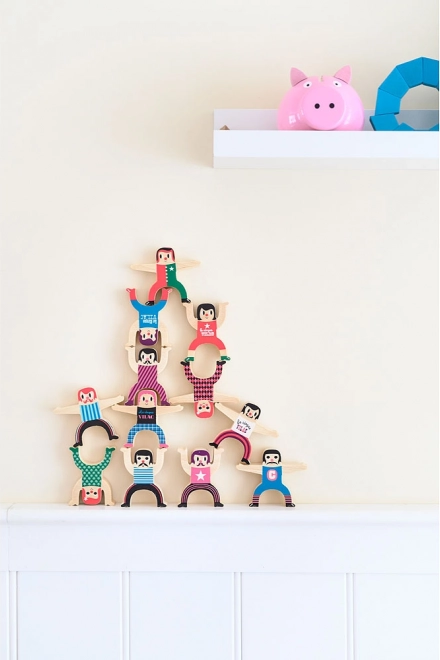 Zgradite svoj stolp akrobatov in preizkusite svojo spretnost ter domišljijo. Lesene figurice v živahnih barvah lahko zlagate v številne stabilne in drzne položaje, zaradi česar je ta igrača idealna izbira za skupno igranje in učenje ravnotežja.