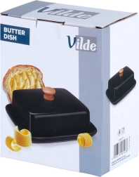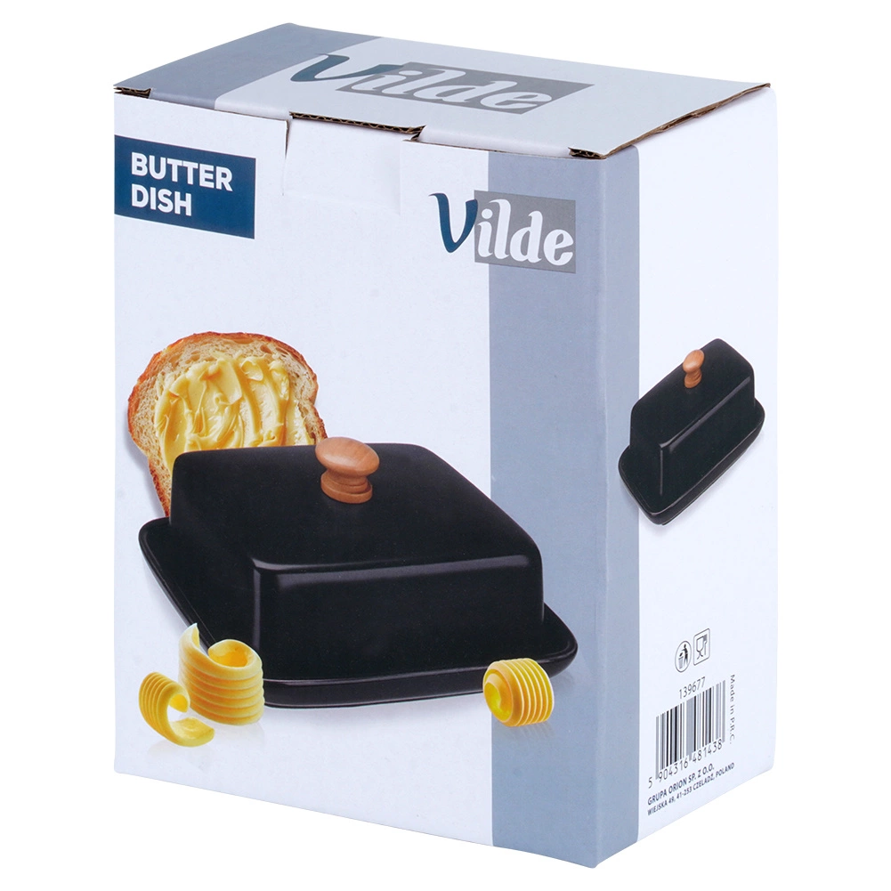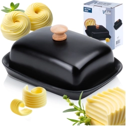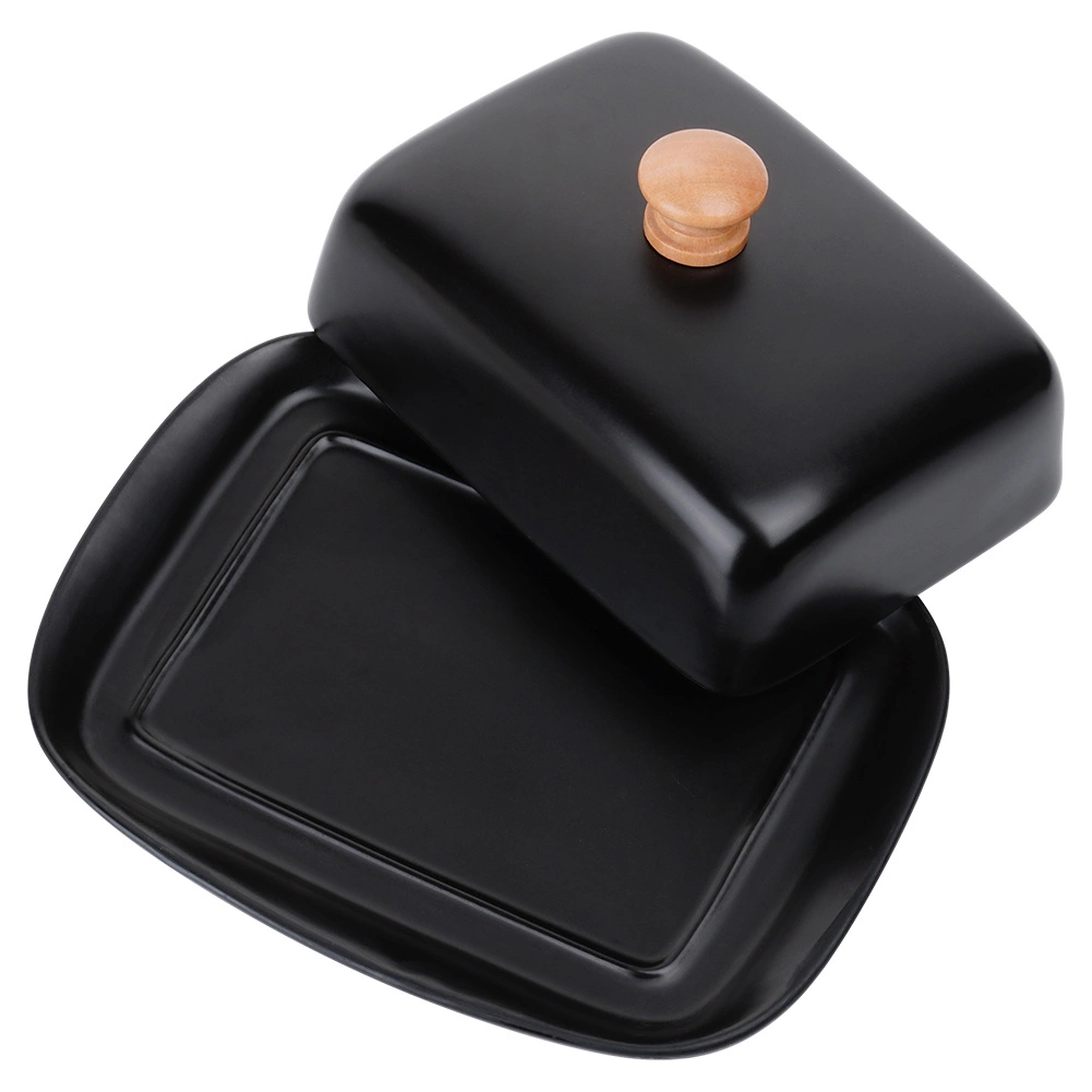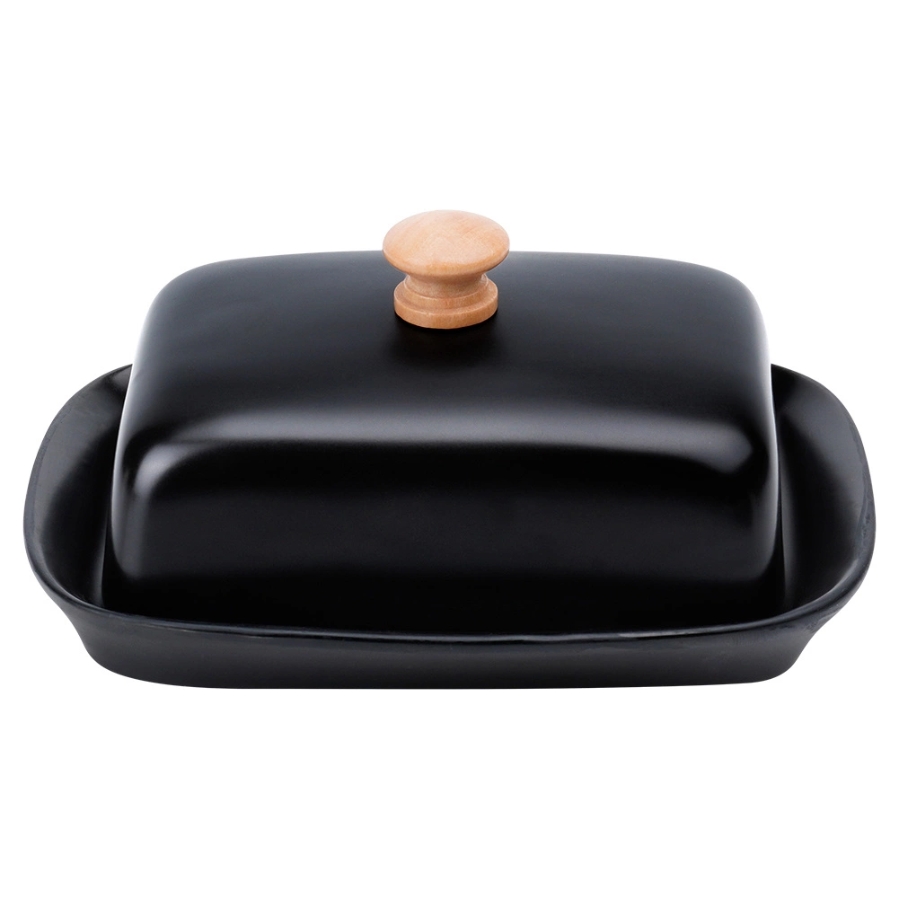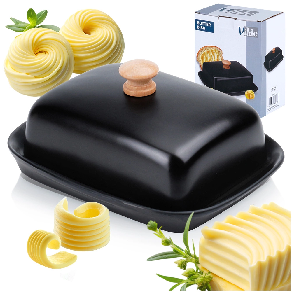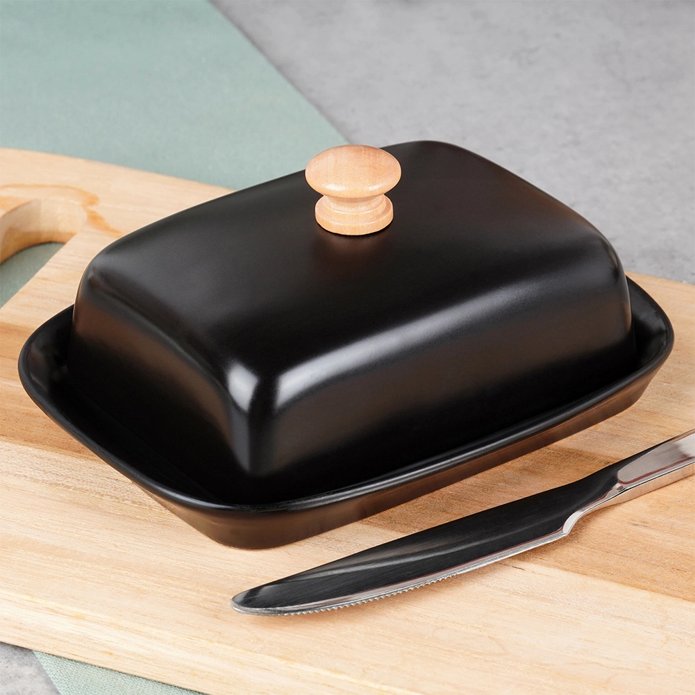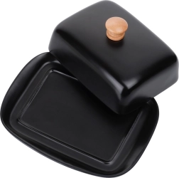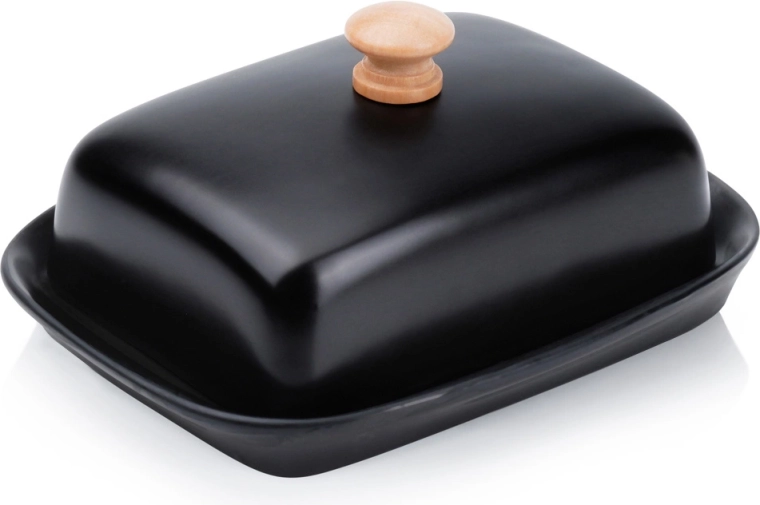 Ta stilska posoda za maslo iz kakovostne keramike v črni izvedbi je idealna za vsakodnevno uporabo doma in za serviranje na mizi. Leseni ročaj na pokrovu omogoča udobno dvigovanje, medtem ko tesno prilegajoč pokrov ščiti maslo pred izsuševanjem in tujimi vonjavami.