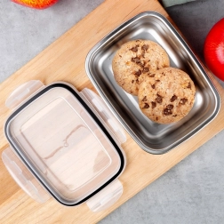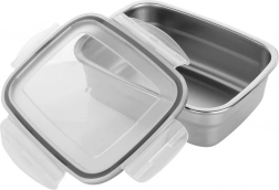 Prozoren pokrov z gumijastim tesnilom in 4 robustnimi sponkami zagotavlja zanesljivo zapiranje brez prelivanja. Nerjavna skleda bolje ohranja želeno temperaturo jedi – toplih in hladnih – ter je odporna proti vonjavam in madežem. Posodo je mogoče udobno pomivati v pomivalnem stroju.