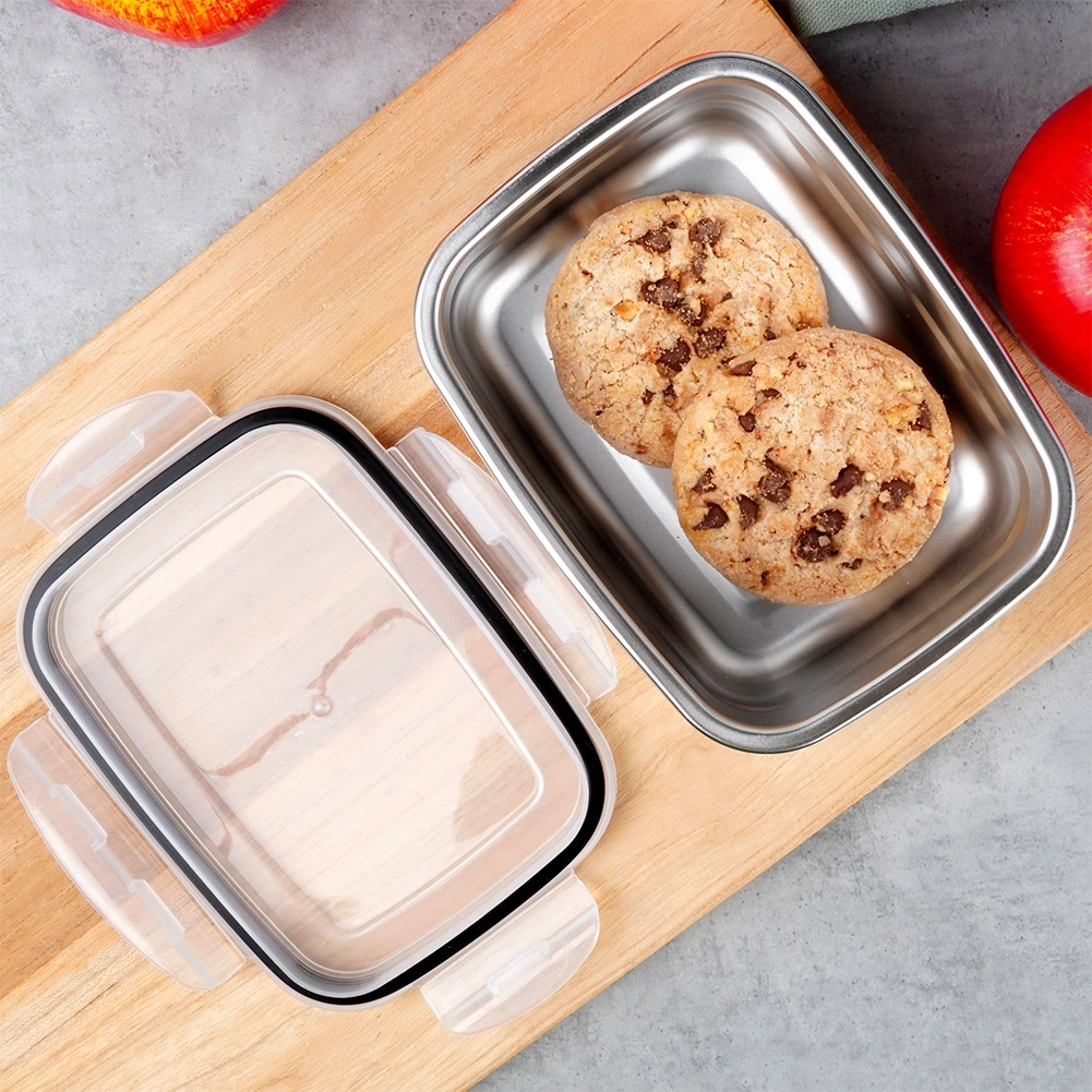 Praktična in higienska posoda za živila iz nerjavnega jekla ščiti hrano pred vlago in zrakom, jo dlje ohranja svežo in je odlična za vsakodnevno uporabo. Zahvaljujoč kompaktnim meram 14,5 × 11,5 × 5,5 cm se prilega v torbo ali šolski nahrbtnik, prostornina 500 ml pa je idealna za solate, priloge ali prigrizke.