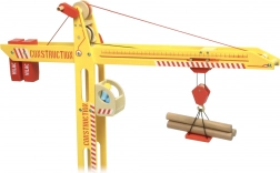 V paketu so premične figurice žerjavista in delavca, platforma, magnetna kljuka, različni tovori in prometna signalizacija za omejitev delovišča – skupaj 12 kosov dodatkov. Kakovostni materiali (masiven les, trpežna vezana plošča, kovinski elementi) in neškodljive barve zagotavljajo dolgo in varno zabavo.