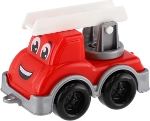 Set vsebuje tri barvne avtomobilčke - gasilski avto, osebni avto in kombi, vsi s prijaznim obrazom in varni za otroke.