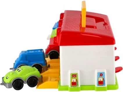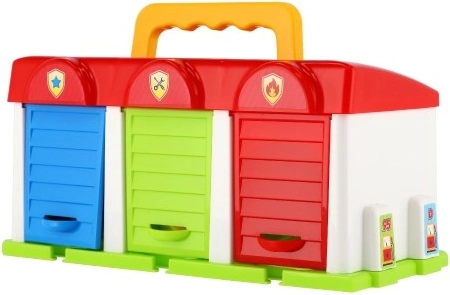 Ta barvita plastična garaža je idealna za vsakega majhnega ljubitelja avtomobilov. Ponuja shranjevalni prostor za tri avtomobile, ki so del seta: gasilski avto, osebni avto in kombi. Vsak avto ima svoj lasten vstop v garažo, kar zagotavlja enostaven vstop in izstop. Garaža podpira domišljijsko igro in razvija motorične sposobnosti otrok.