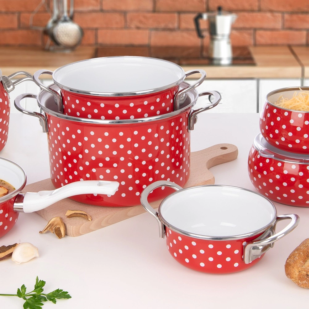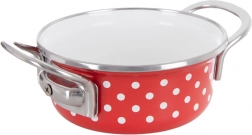 Rdeč emajl z belimi pikami kuhinji doda šarm. Gladka emajlirana površina se zlahka čisti in je primerna za pomivalni stroj.