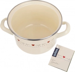 Izdelan iz kakovostnega emajliranega jekla v krem barvi z nežnim motivom srčkov. Nerjaven rob povečuje življenjsko dobo in poudari eleganten videz.