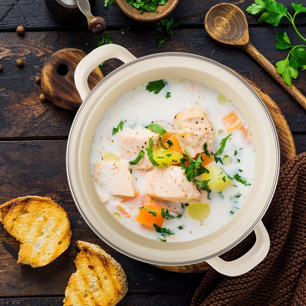 Slogoven lonec v retro dizajnu iz kakovostnega emajliranega jekla v krem barvi z diskretnim motivom src. Praktična prostornina 1,4 l je idealna za juhe, omake, priloge in vsakodnevno kuhanje. Emajl je odporen, enostaven za čiščenje in prijazen do zdravja – primeren tudi za alergike.