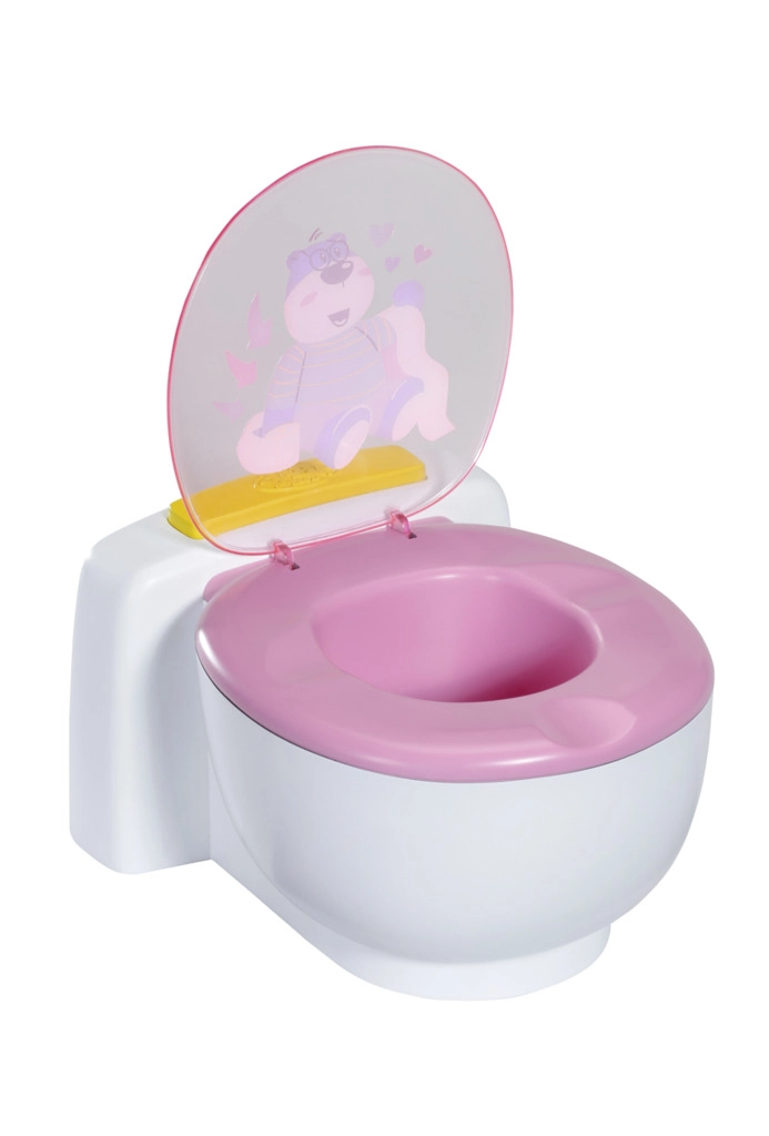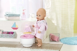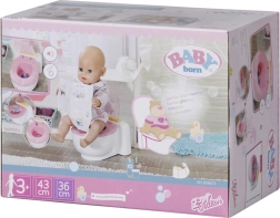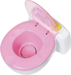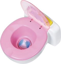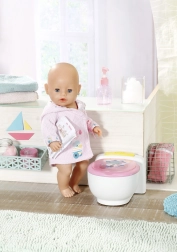 BABY born že hodi na stranišče! Ko se usede na svoj beli prestol z rožnatim sedalom, boš slišal zvoke lulanja, aplavza in veselega smeha. BABY born pa zna tudi kakati. V tem primeru se v školjki pojavi pisano bleščeče kakce. Hitro, čas je za splakovanje! Ko pritisneš gumb za splakovanje, kakec izgine in zaslišiš zvoke splakovanja.