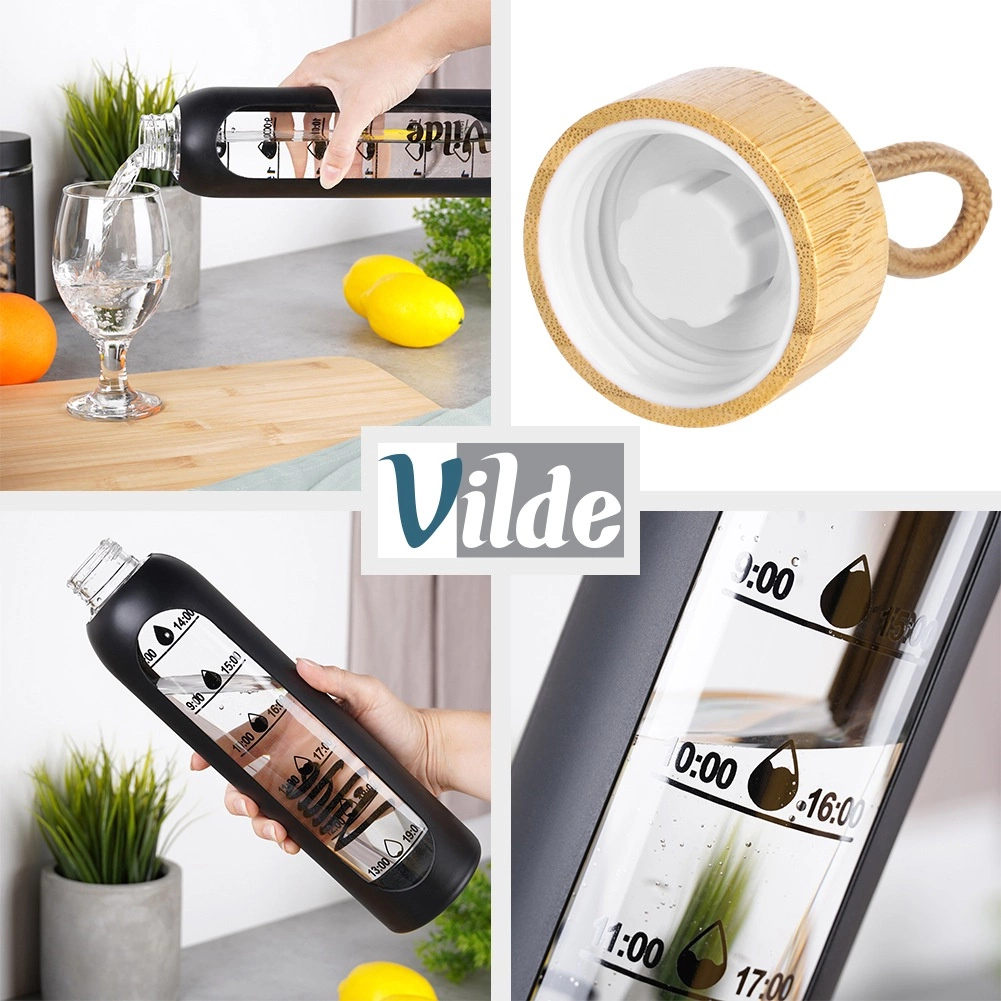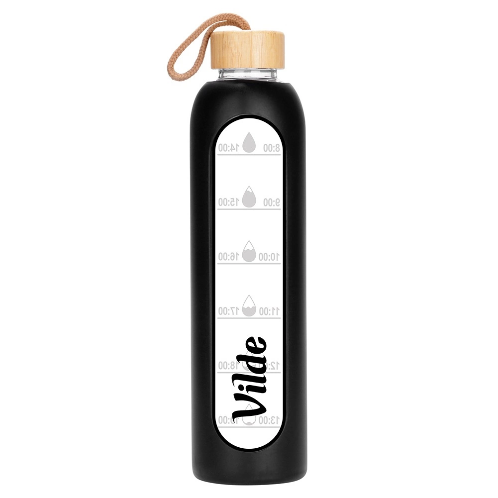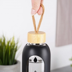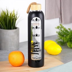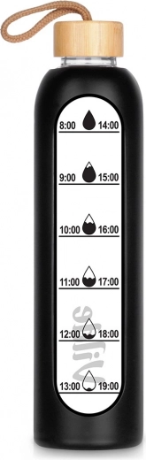 Poskrbite za hidracijo v slogu tudi na poti. Ta elegantna 1‑litrska steklena steklenica s črnim silikonskim ovitkom in bambusovim navojnim pokrovčkom je idealna za vodo, domače limonade, sokove, smoothieje in koktajle. Časovne oznake od jutra do večera vas nežno vodijo k rednemu pitju.