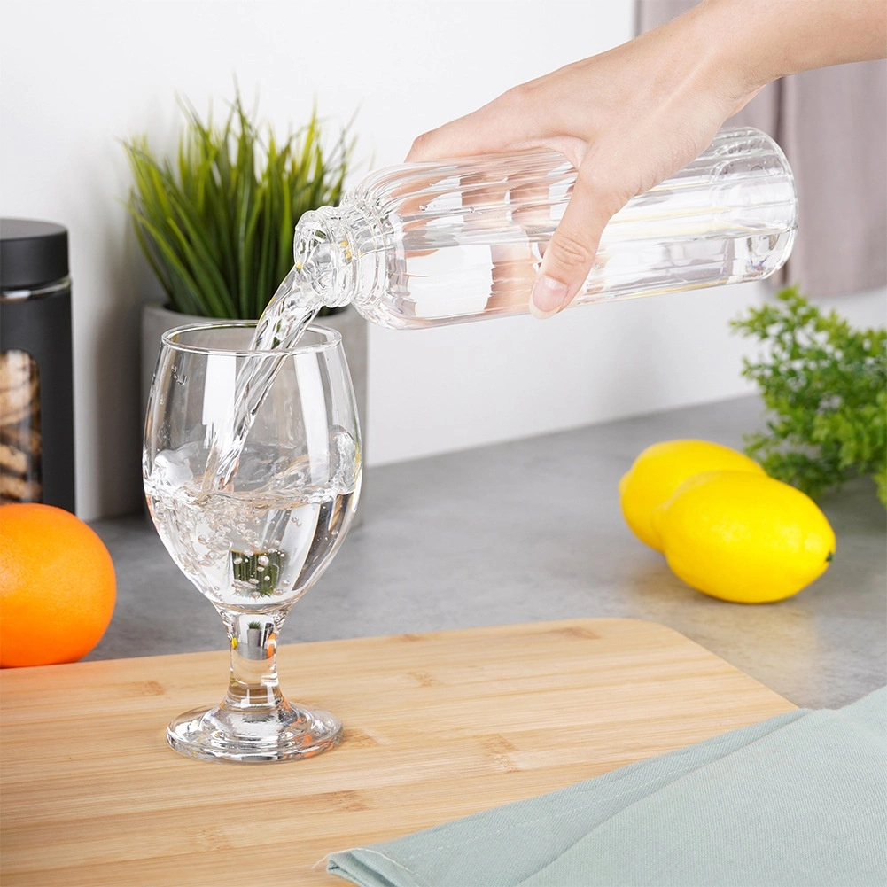 Vertikalno žlebičenje stekla izboljšuje oprijem in daje steklenici moderen videz, primeren za pisarno in na pot.