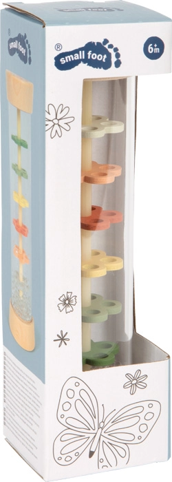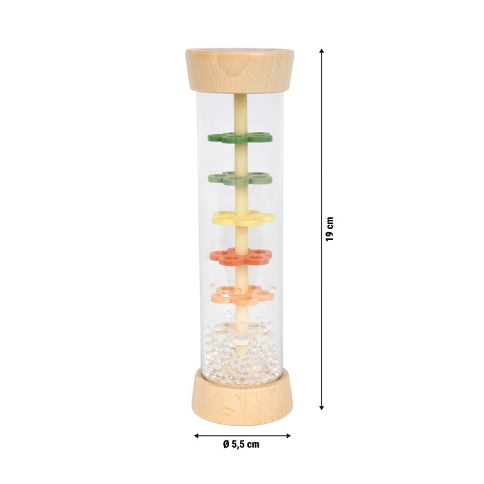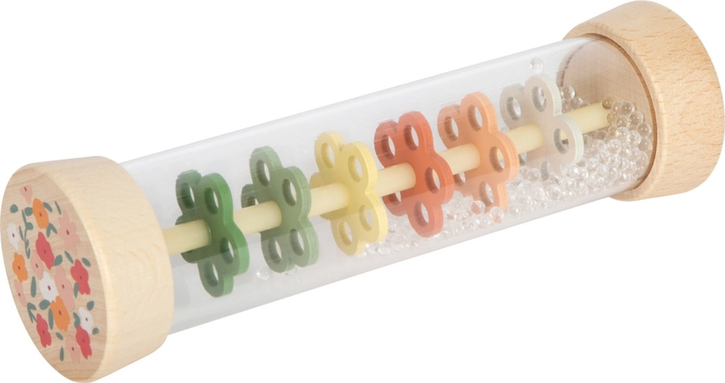 Dežna palica Mali prijatelji prinaša otrokom čarobnost padajočih kapljic naravnost v dlani. Bleščeče kroglice se počasi sipajo skozi barvite cvetlične ploščice v prozorni cevi in ustvarjajo enakomeren, sproščujoč zvok. Idealno za trenutke umiritve, prve ritmične poskuse in kot barvit ropotuljček.