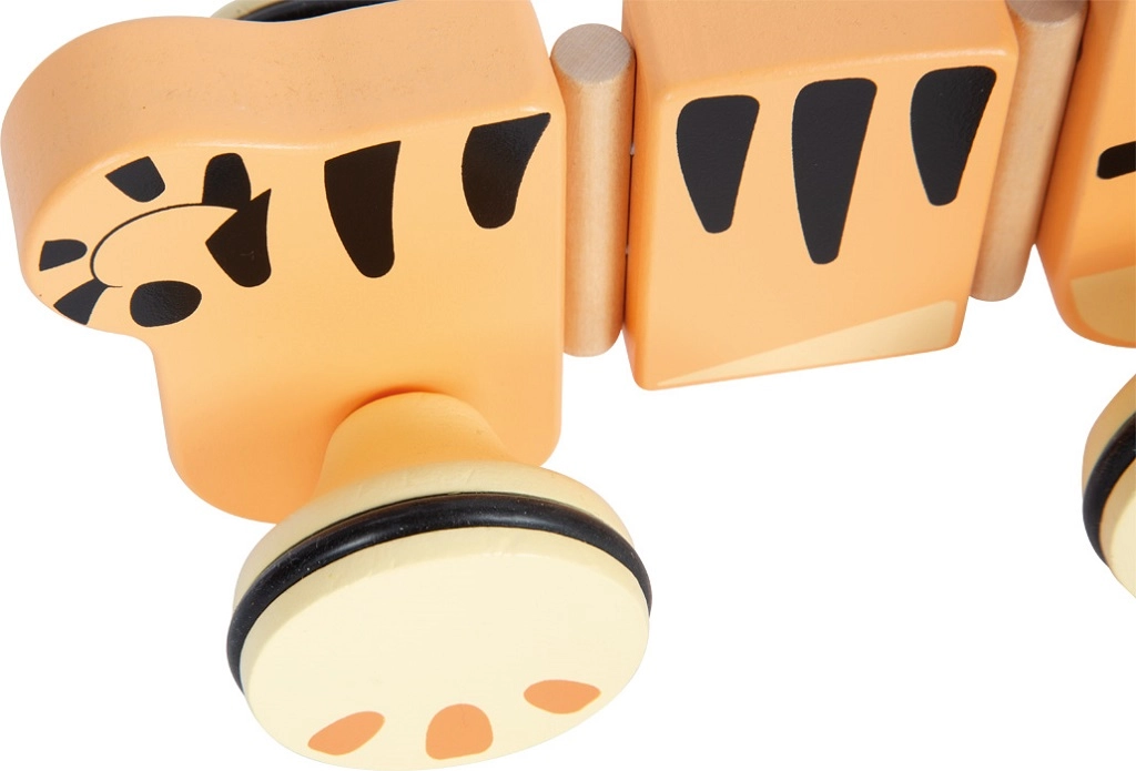 Ta kakovostno izdelan vlečni tiger izstopa po okolju prijaznih materialih in varni zasnovi. Gladko zaobljeni robovi, tih tek in trdni spoji segmentov zagotavljajo udobno in varno uporabo doma in na sprehodih. Otroci bodo vzljubili njegov prijazen izraz in gladko valovanje med gibanjem.