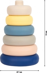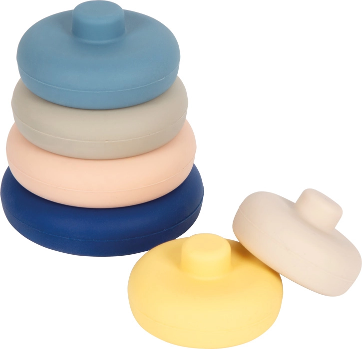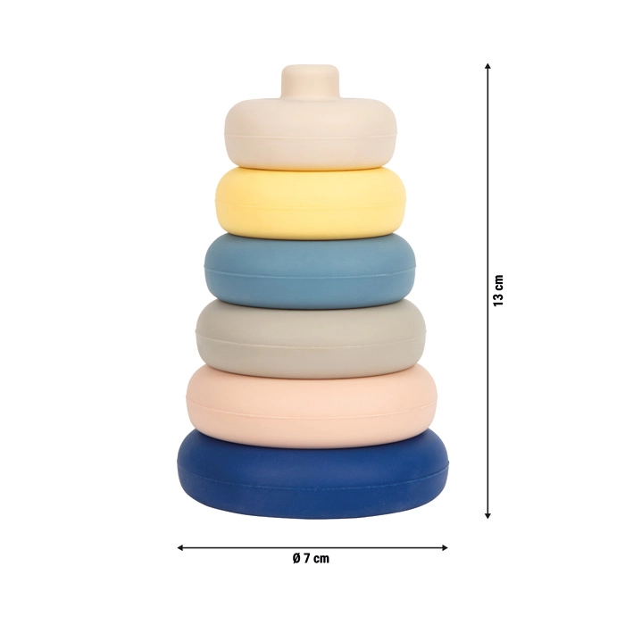 Ta 6-delni silikonski stolp je idealna prva gradbena igrača za dojenčke in malčke. Deli so prožni, prijetni na dotik in odlično sedejo tudi v majhne rokice. Zaradi odsotnosti trde palice je zlaganje intuitivno in varno že od prvih poskusov.