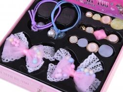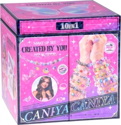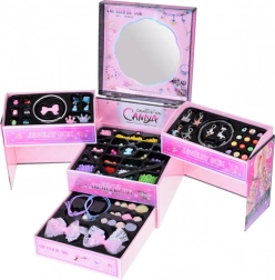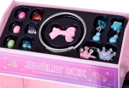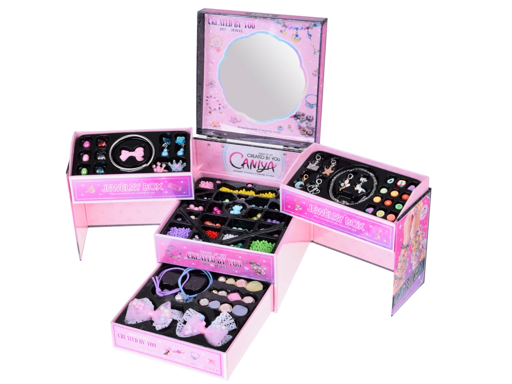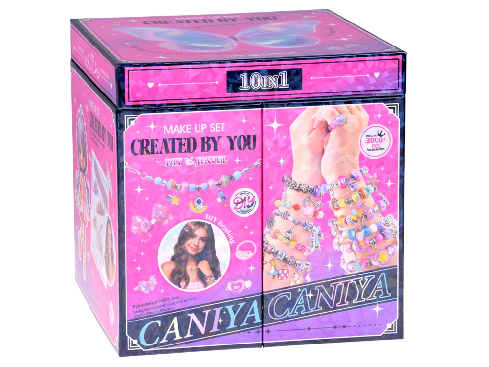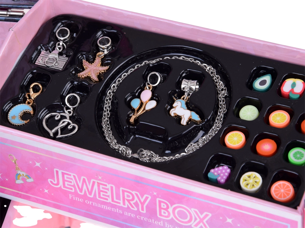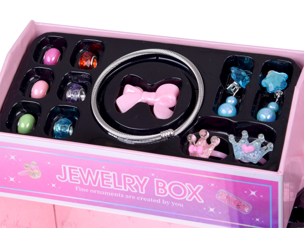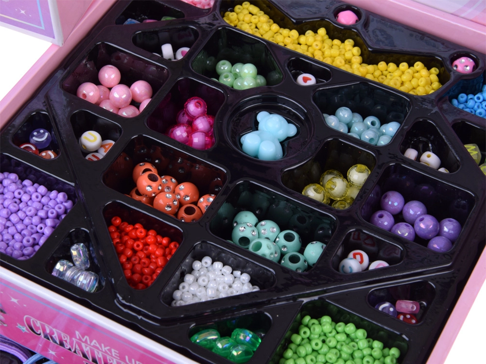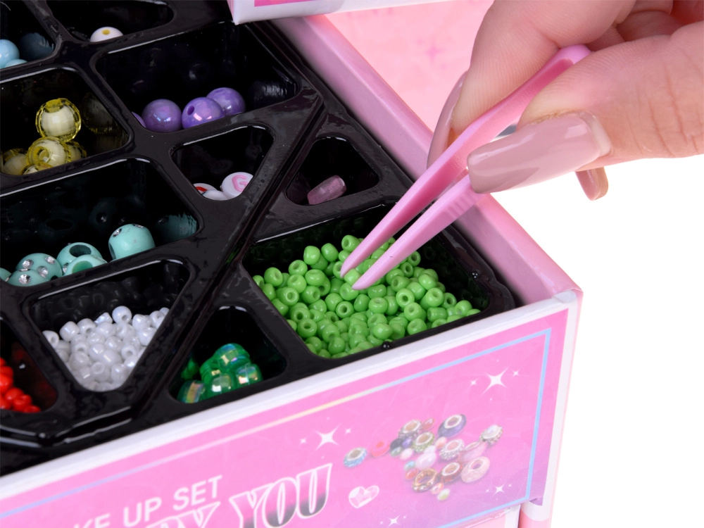 Škatlica za nakit ponuja tri pregledne nivoje: zgoraj veliko ogledalo in predalčke za prstane, uhane ter dodatke za zapestnico in verižico, na sredini barvite bisere različnih oblik in velikosti za enostavno nizanje, spodaj pa okraskе za lase – gumice, sponke in pentljice za dovršitev stajlinga. Zahvaljujoč elastični vrvici in pinceti je nizanje udobno tudi za začetnike.