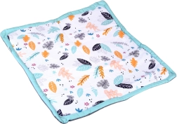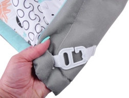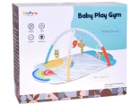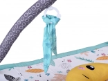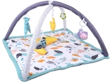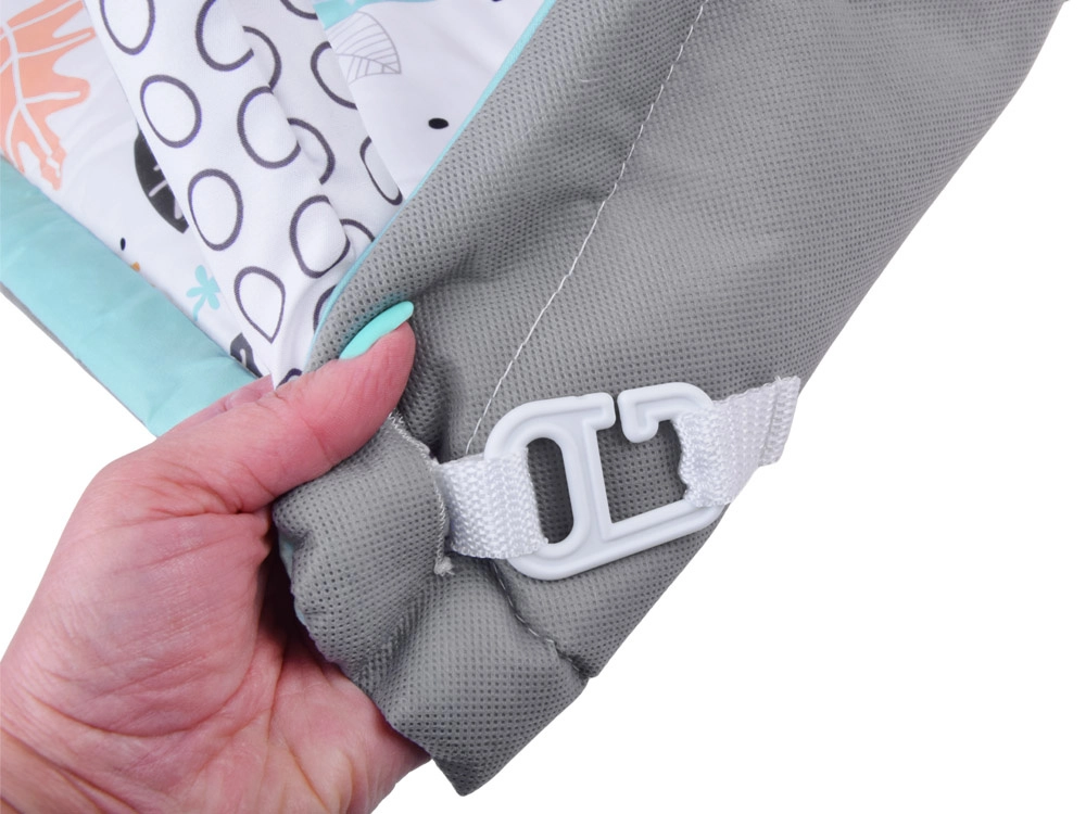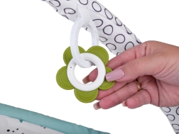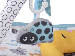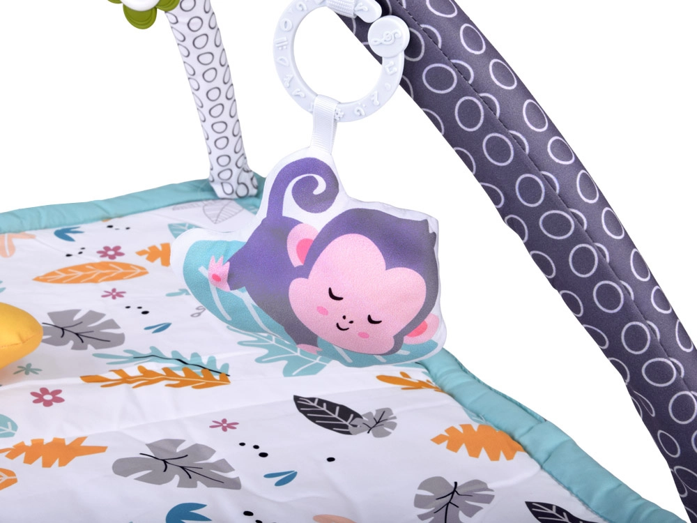 Ta večnamenska igralna podloga v nežnem skandinavskem slogu dojenčku zagotovi udobno in izolirano mesto na tleh. Dva križna loka z visečimi igračami (bananček, pikapolonica, opička, cvetek–grizalo in druge) spodbujata k stezanju in prijemanju, kar naravno krepi roke, vrat in trup ter podpira koordinacijo oko–roka. Del kompleta je tudi mehka podporna blazinica, idealna za tummy time.