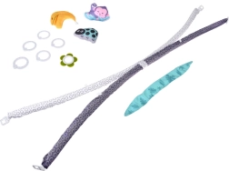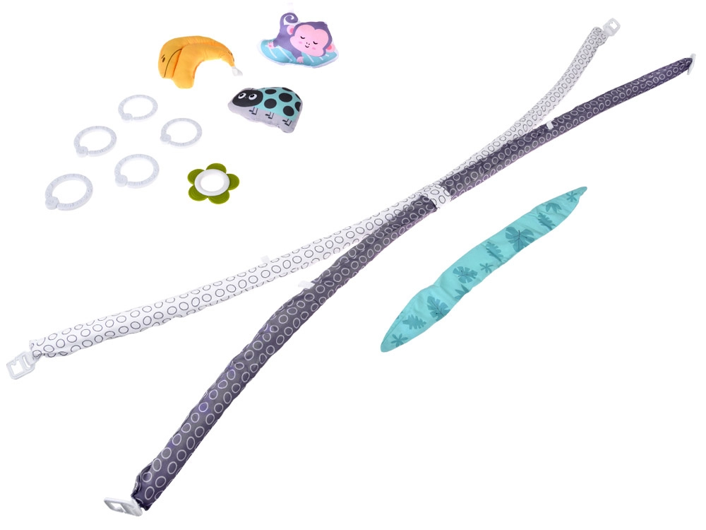 Viseče igrače, vključno s šumečimi listki, mehko opičko s piskalnikom, tekstilno banano, prikupno pikapolonico z zvončkom in cvetkom–grizalom, motivirajo dojenčka k raziskovanju in prijemanju.