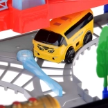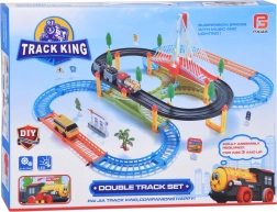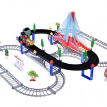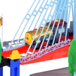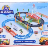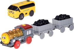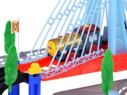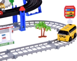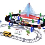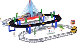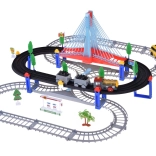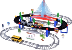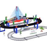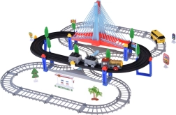 Ta električna vlakovna proga z večnivojskimi tirnicami in visečim mostom prinaša otrokom ure ustvarjalne igre. Lokomotiva z vagoni in rumeni mestni avtobus se premikata po povezanih progah, prečkajo most ter vozita mimo prometne signalizacije, dreves in male bencinske postaje. LED osvetlitev ter zvoki lokomotive z melodijami dodajo igri pristnost.