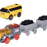 Parna lokomotiva vleče vagone z ogljem, oddaja zvoke motorja in predvaja vesele melodije. Otroci bodo uživali v avtentični vožnji po večnivojski progi.